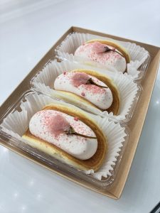 ふんわりとした生地に、桜の風味を感じるクリームを合わせた優しい味わいのお菓子です。アクセントに添えた桜の花が見た目にも春らしく、お花見にもぴったり。