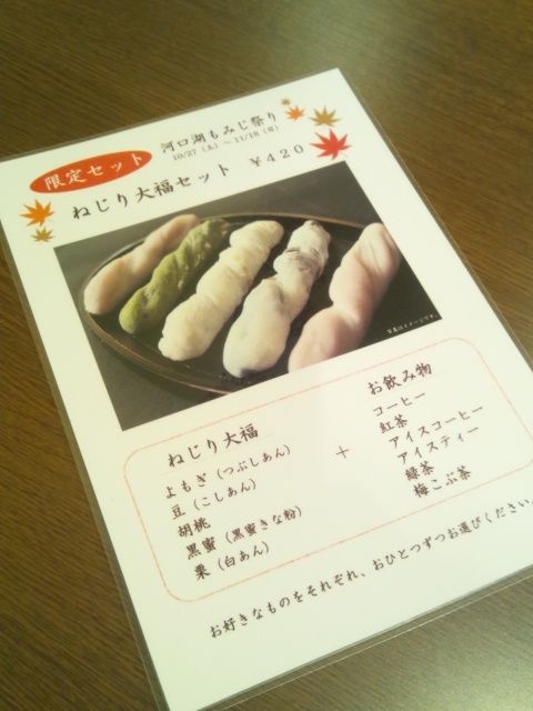 ねじり大福おひとつとお飲み物のセットです。(セットで420円)
