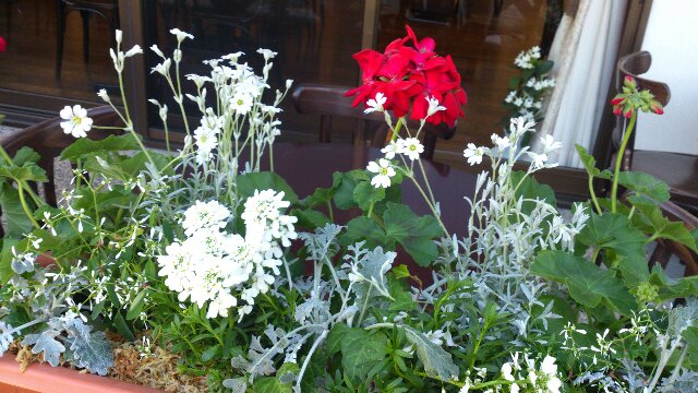 真っ赤なゼラニウムに、白いイベリスとユーフォルビア、さらにシルバーリーフが素敵なセラスチューム。