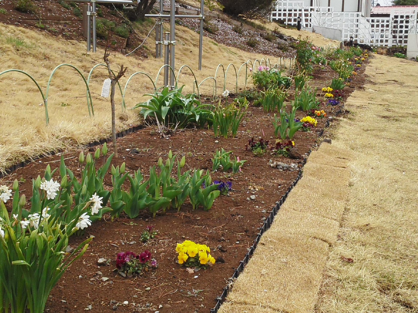 2014年04月20日 花散らしの・・・ 公開済み: 2014年4月20日更新: 2014年4月20日作成者: HEIDI'S FLOWER GARDEN・桔梗屋飲食店カテゴリー: HEIDI'S FLOWER GARDEN・桔梗屋飲食店 今日の河口湖は冬に逆戻りしたように寒くなってしまいました。 ガーデン内の桜は、昨日からの雨で散りだしました。小鳥が、蜜を吸いに来て飛び回っていて、花を落としています。 湖畔の桜は、今とても綺麗です。 女神の広場は暖かいので、花壇のチューリップが色づいてきました。 長花壇は、今こんな感じです。 レストラン前に、花売り場を作りました。一足早く咲いている紫陽花、今日の雨に似合っています。 hiromi