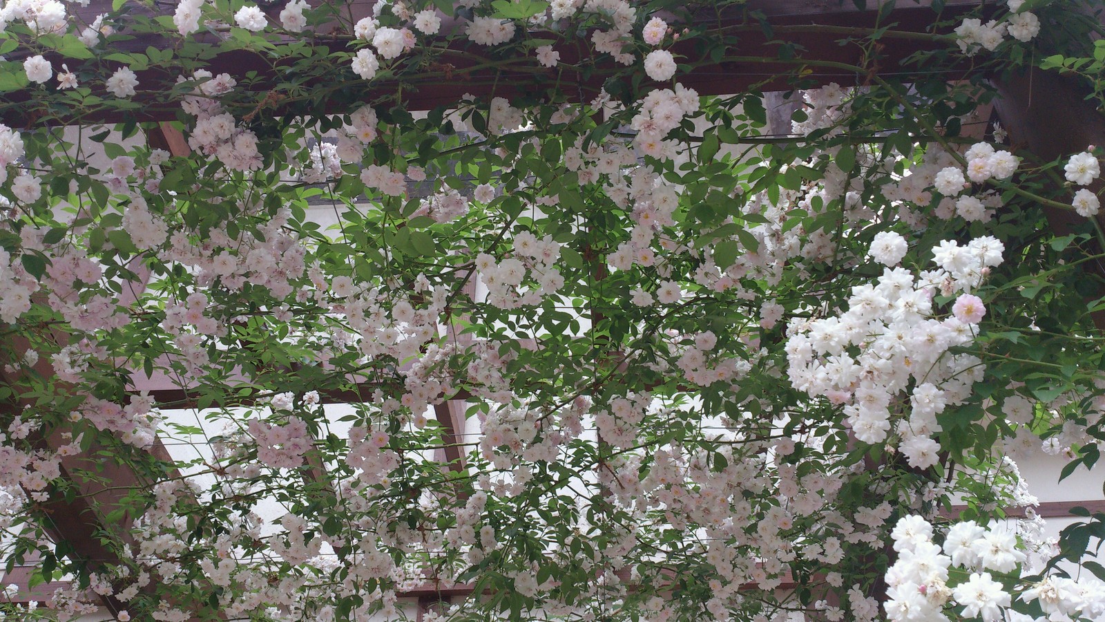 また今このテラスにあるバラの中でも、一番の見ごろを迎えているのが、こちらのポールズ・ヒマラヤン・ムスクです。
